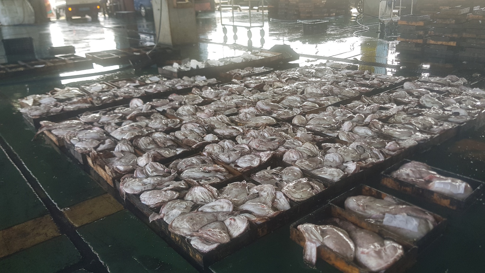 이곳은 배에서 잡아올린 아귀들이 경매를 위해서 기다리고 있는 모습입니다. 양이 엄청나지요.