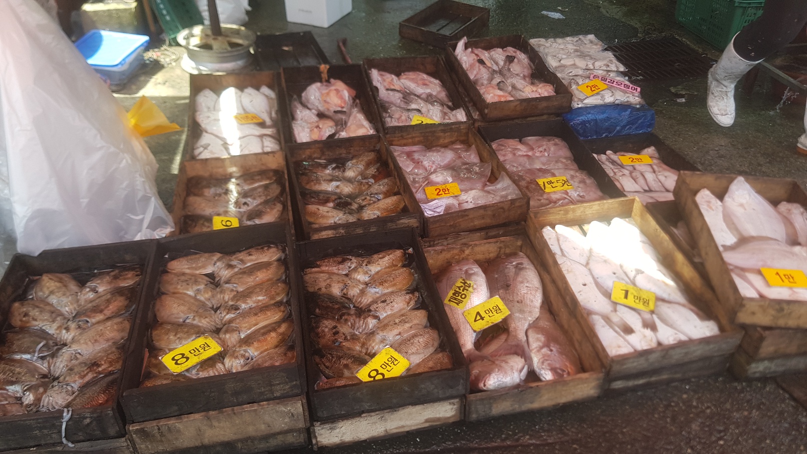 나무 상자에 수산물이 담겨있고 가격표가 있는데 한마리 가격이 아니라 통에 담겨있는 전체 수산물의 가격이에요. 맨 오른쪽 광어는 그냥 봐도 10마리가 넘어보이는데 크기가 작어서 만원에 팔고 있네요. 가격은 가게마다 차이가 있으니 다 돌아보시길 추천드려요. 어떤곳은 60센티가 넘어보이는 커다란 광어를 3만원에 팔았는데 또 어떤곳은 같은 크기의 광어를 2만원에 팔기도 했어요.