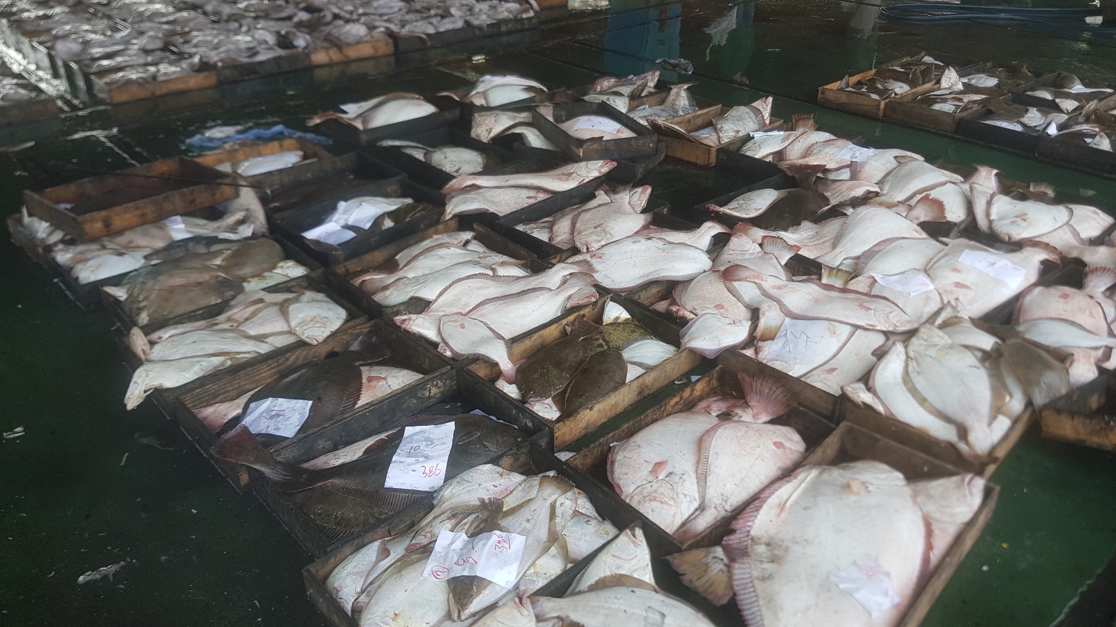 바다에서 잡아올린 싱싱한 광어들도 각자 이름표를 달고 팔려나갈 준비를 하고 있습니다.